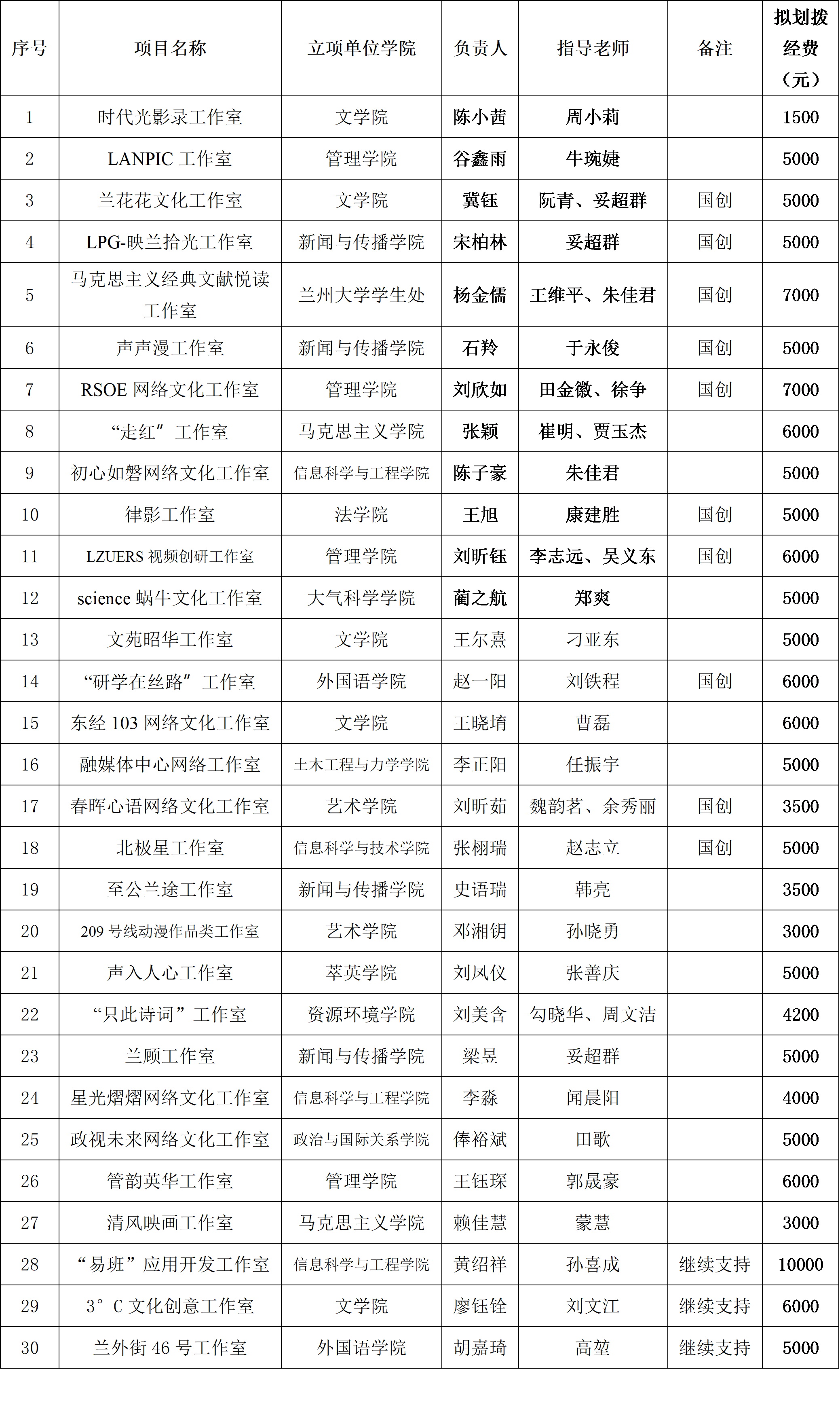 根据《关于开展兰州大学2022年度学生网络文化工作室培育建设工作的通知》,经学生本人申报、学院推荐、立项答辩、学校评审等环节,确定2022年立项支持30个学生网络文化工作室项目。其中10个项目推荐为国家级大学生创新创业训练计划创业训练类项目,并给予经费支持,20个项目由易班发展中心给予经费支持,经费管理根据学校财务管理有关规定执行。现将立项工作室情况公布如下: