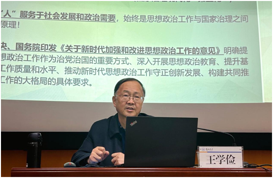 3月17日上午,兰州大学辅导员“铸魂工程”第十二讲辅导报告在榆中校区天山堂C302报告厅举行,马克思主义学院王学俭教授应邀作“新时代我国国家治理中的思想政治工作”专题报告。全体专职辅导员、学生工作部门工作人员参加。报告由校团委书记赵赟主持。 王学俭围绕思政工作在国家治理中的“角色”“功能”“目标”与“发展”深入细致展开论述。王学俭指出,世界正处于“百年未有之大变局”,是当前一个时期我国思想政治工作与国家治理面临的最大环境。思想政治工作作为治党治国的重要方式,是一切工作的“生命线”,应在国家治理中发挥好围绕中心、以人为本、服务大局的基本职责,推动思想政治工作与国家治理现代化同向而行。