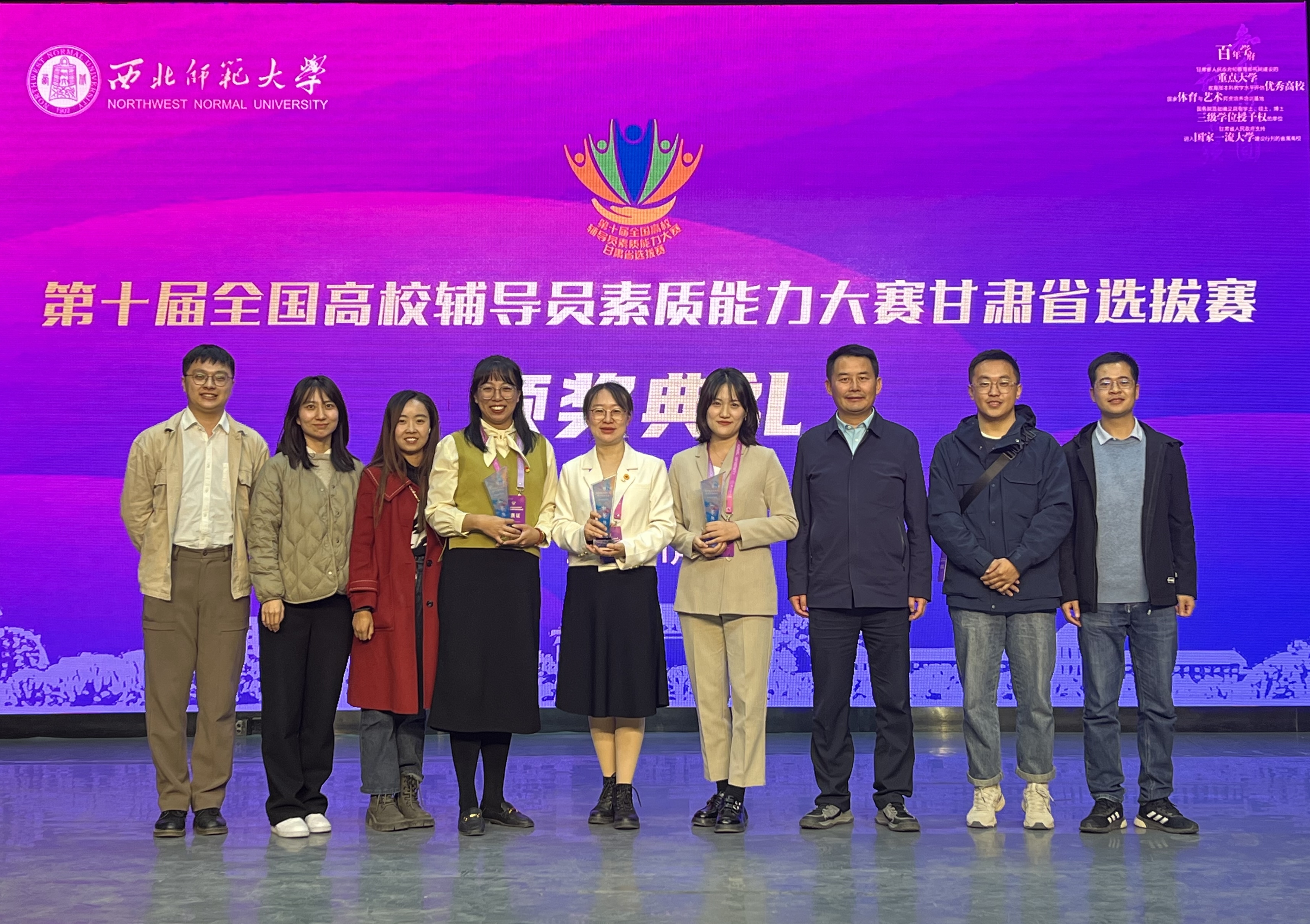 11月10日至11日,由中共甘肃省委教育工作委员会主办的第十届全国高校辅导员素质能力大赛甘肃省选拔赛在西北师范大学举行。经过激烈角逐,我校选派的3名辅导员在全省40余所高校的57名辅导员中脱颖而出,核科学与技术学院刘凯璇力拔头筹获特等奖,草地农业科技学院高雪、口腔医学院王梦瑶获一等奖,充分展现了我校辅导员扎实的专业素养和良好的精神风貌。